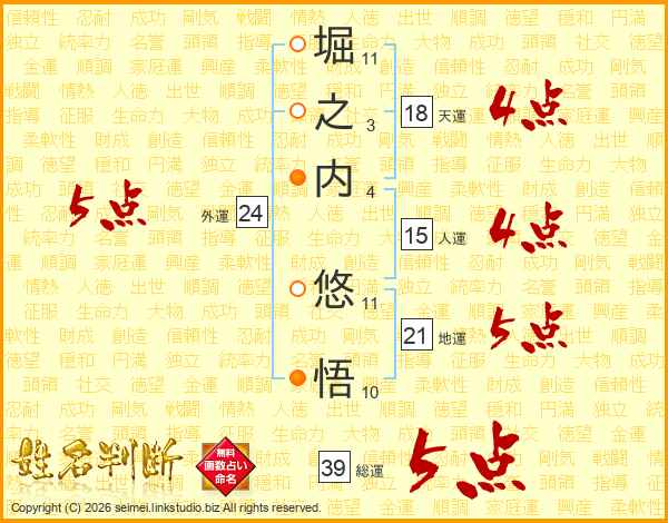 堀之内悠悟さんの総運は39画の5点!