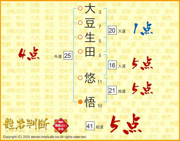 大(3画)豆(7画)生(5画)田(5画) 悠(11画)悟(10画)