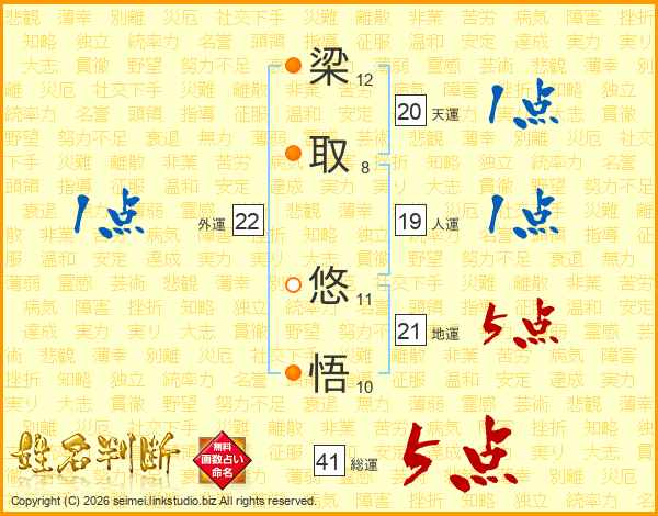 梁(12画)取(8画) 悠(11画)悟(10画)
