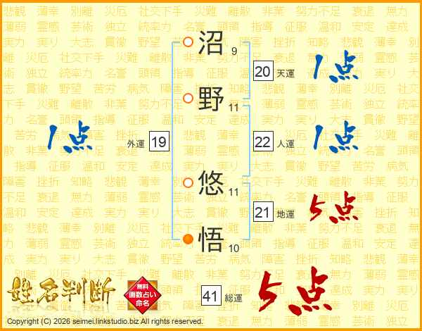 沼(9画)野(11画) 悠(11画)悟(10画)