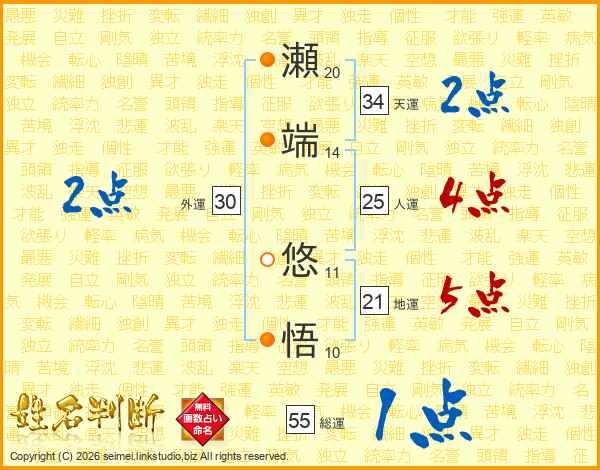 瀬端悠悟さんの地運は21画の5点!