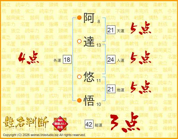 阿(8画)達(13画) 悠(11画)悟(10画)