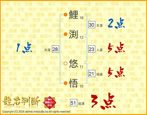 鯉渕悠悟さんの総運は51画の3点!