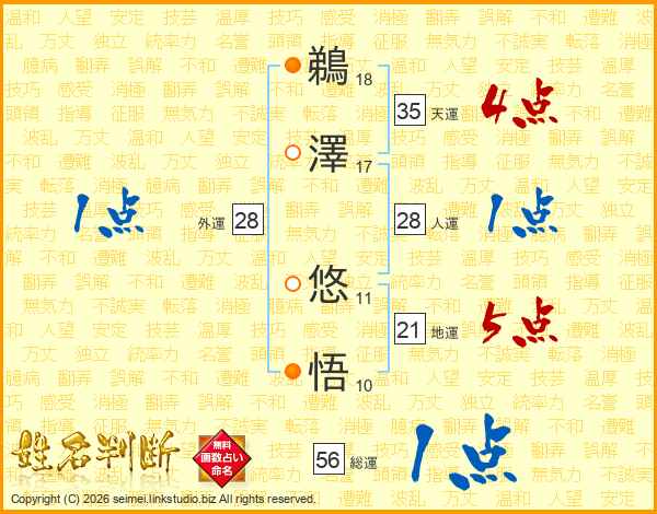 鵜(18画)澤(17画) 悠(11画)悟(10画)