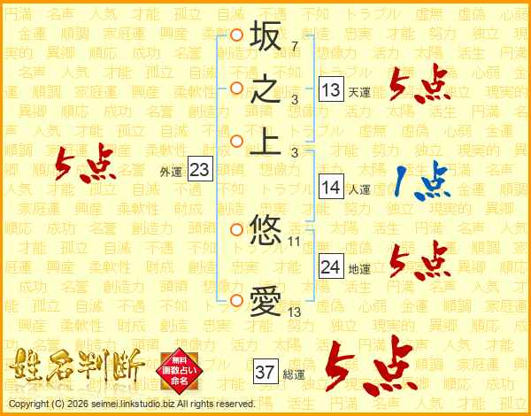坂之上悠愛さんの総運は37画の5点!