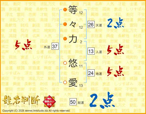 等(12画)々(12画)力(2画) 悠(11画)愛(13画)