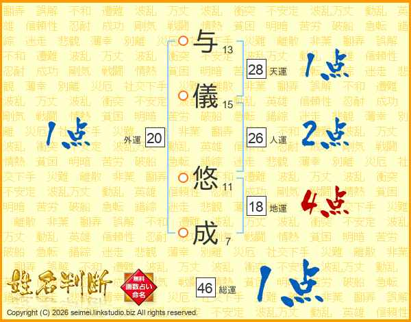 画数の奇数(○陽)と偶数(●陰)の配列で吉凶を占います。どちらかにかたよる名前は大凶名で避ける必要があります。画数の奇数偶数。
