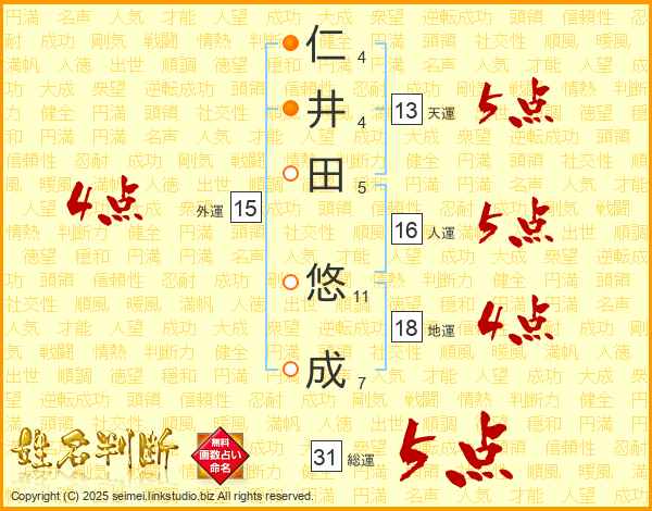 仁(4画)井(4画)田(5画) 悠(11画)成(7画)