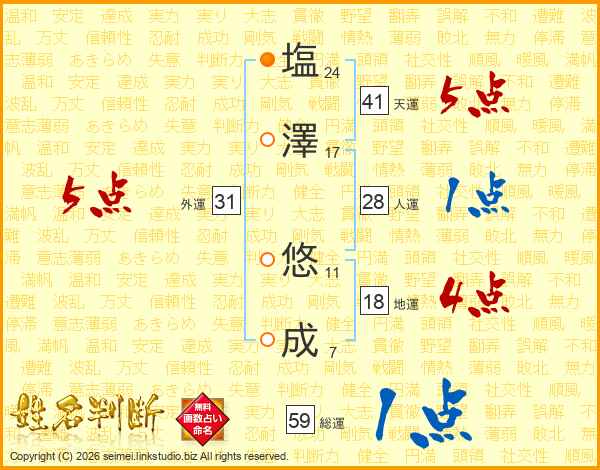 塩(24画)澤(17画) 悠(11画)成(7画)