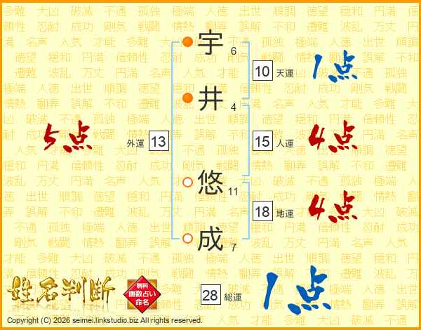 宇(6画)井(4画) 悠(11画)成(7画)