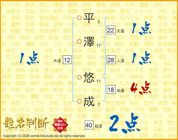 生活面を象徴する運勢です。外部から受ける影響力を表し、結婚運、家庭運や職場、環境への順応性を表します。総運から人運を引いた画数。姓や名が1文字の場合を除く。