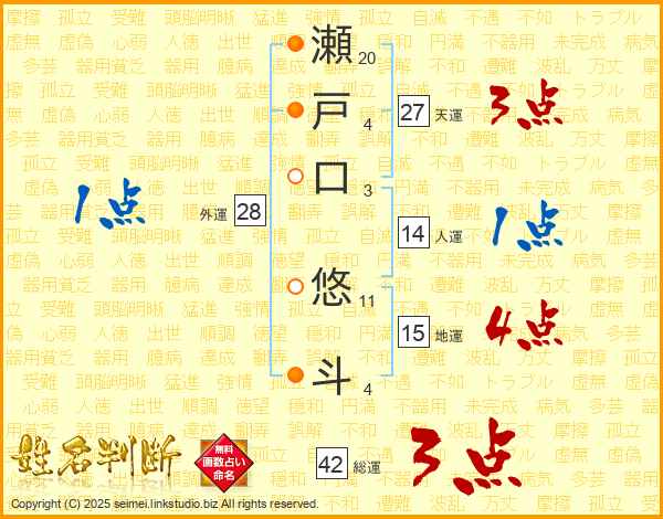 瀬(20画)戸(4画)口(3画) 悠(11画)斗(4画)