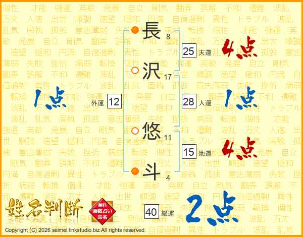 長(8画)沢(17画) 悠(11画)斗(4画)