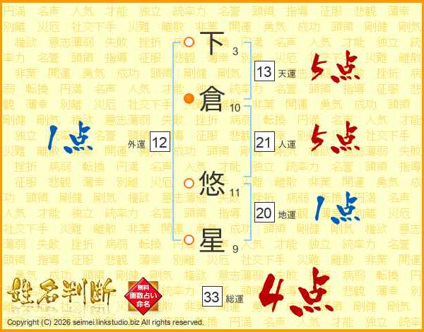 下倉悠星さんの総運は33画の4点!
