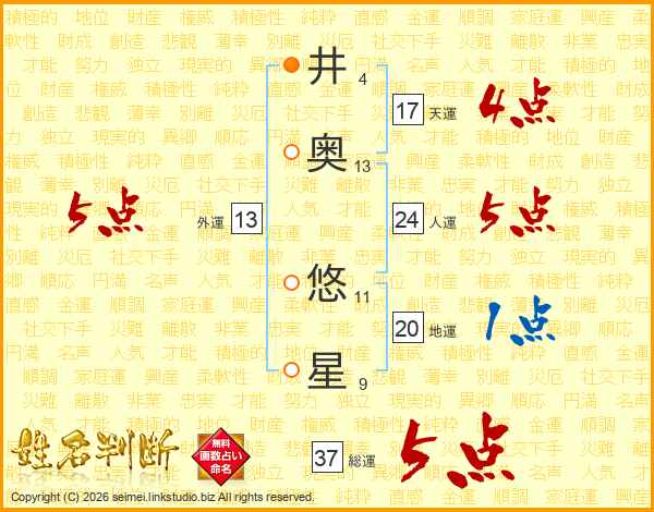 生活面を象徴する運勢です。外部から受ける影響力を表し、結婚運、家庭運や職場、環境への順応性を表します。総運から人運を引いた画数。姓や名が1文字の場合を除く。