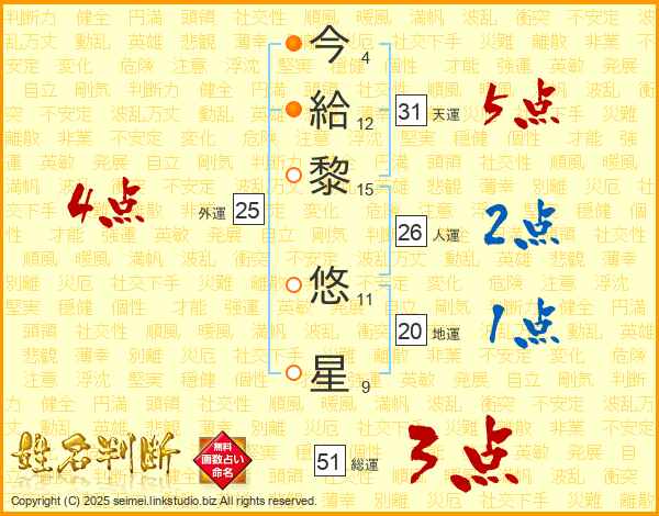 今(4画)給(12画)黎(15画) 悠(11画)星(9画)