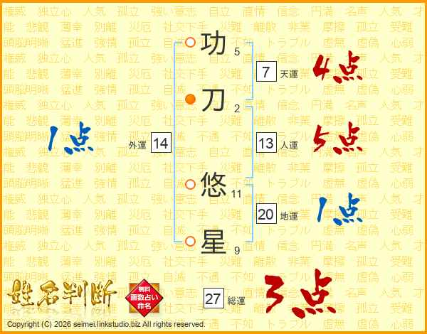 功(5画)刀(2画) 悠(11画)星(9画)