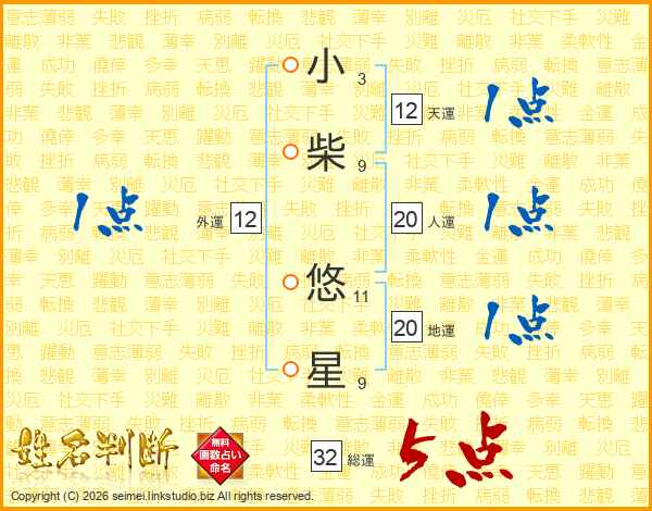 生活面を象徴する運勢です。外部から受ける影響力を表し、結婚運、家庭運や職場、環境への順応性を表します。総運から人運を引いた画数。姓や名が1文字の場合を除く。