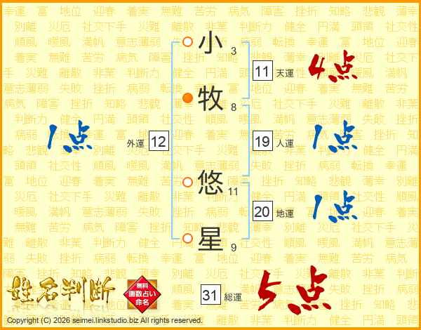 生活面を象徴する運勢です。外部から受ける影響力を表し、結婚運、家庭運や職場、環境への順応性を表します。総運から人運を引いた画数。姓や名が1文字の場合を除く。