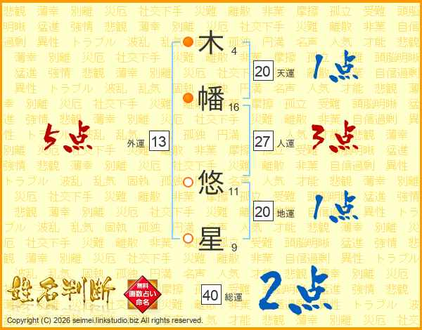 木(4画)幡(16画) 悠(11画)星(9画)