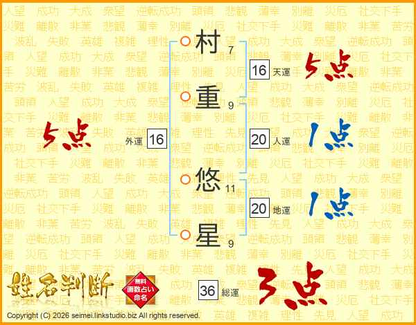 村(7画)重(9画) 悠(11画)星(9画)