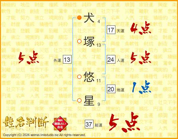犬塚悠星さんの総運は37画の5点!