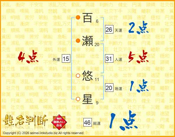 百(6画)瀬(20画) 悠(11画)星(9画)