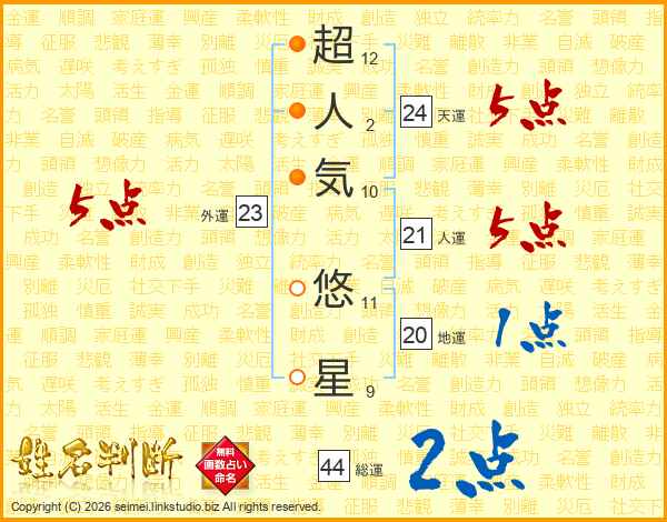 超(12画)人(2画)気(10画) 悠(11画)星(9画)
