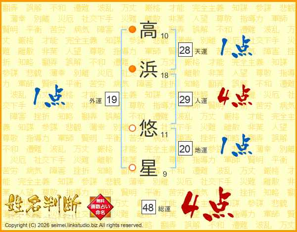 高浜悠星さんの総運は48画の4点!