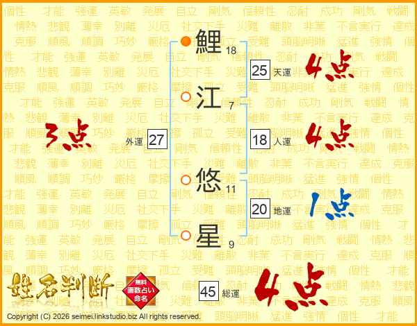 鯉(18画)江(7画) 悠(11画)星(9画)