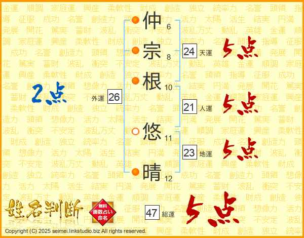 仲(6画)宗(8画)根(10画) 悠(11画)晴(12画)