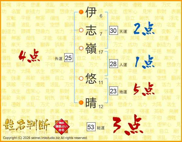 伊(6画)志(7画)嶺(17画) 悠(11画)晴(12画)