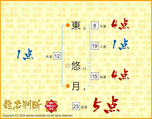 東(8画) 悠(11画)月(4画)