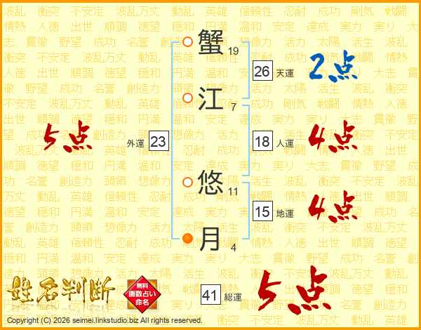 蟹(19画)江(7画) 悠(11画)月(4画)