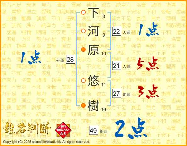 下(3画)河(9画)原(10画) 悠(11画)樹(16画)