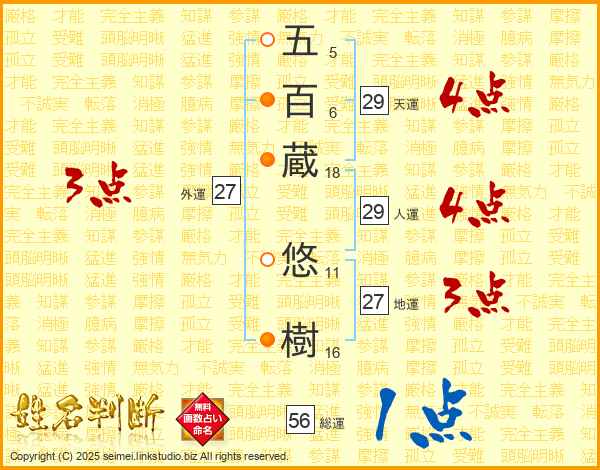 五(5画)百(6画)蔵(18画) 悠(11画)樹(16画)