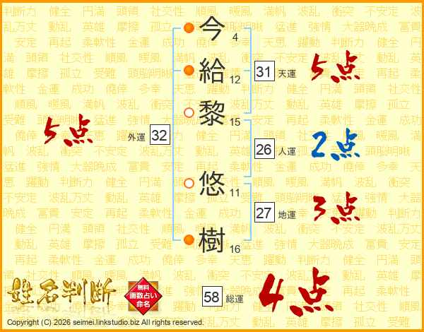 今(4画)給(12画)黎(15画) 悠(11画)樹(16画)