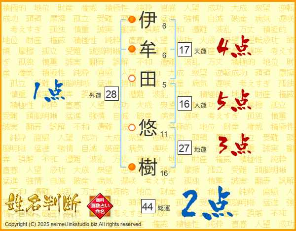 伊(6画)牟(6画)田(5画) 悠(11画)樹(16画)
