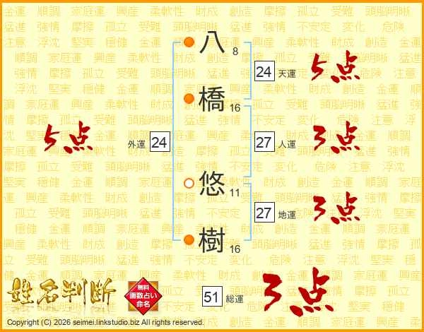 八(8画)橋(16画) 悠(11画)樹(16画)
