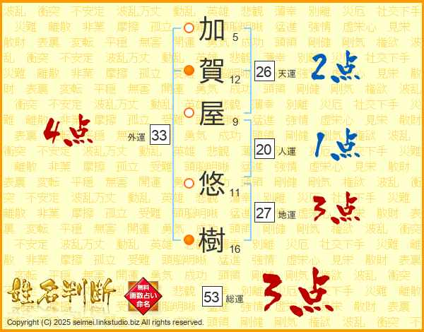 加(5画)賀(12画)屋(9画) 悠(11画)樹(16画)