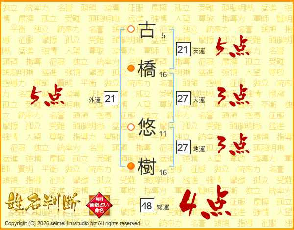 古(5画)橋(16画) 悠(11画)樹(16画)