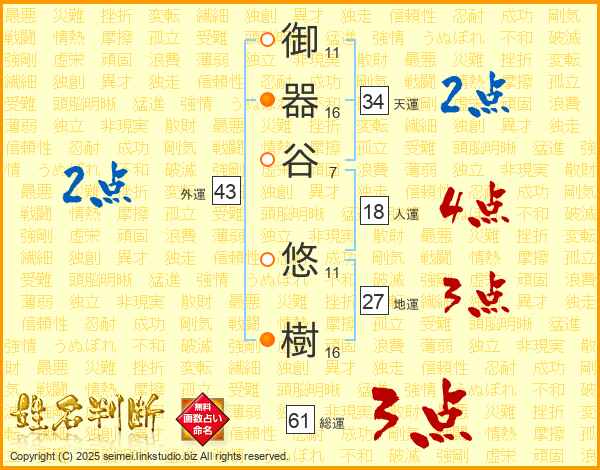 御(11画)器(16画)谷(7画) 悠(11画)樹(16画)