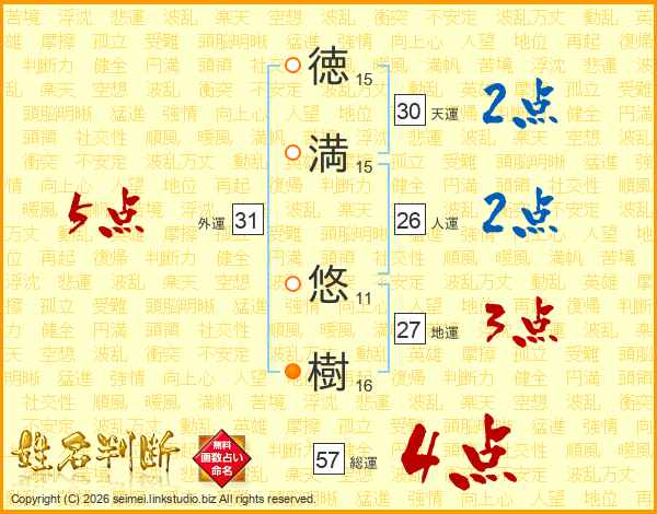徳(15画)満(15画) 悠(11画)樹(16画)