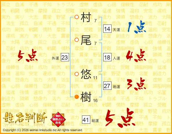 村(7画)尾(7画) 悠(11画)樹(16画)