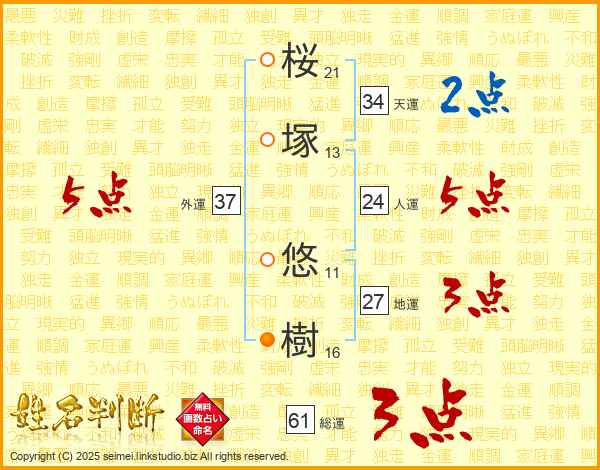 桜(21画)塚(13画) 悠(11画)樹(16画)