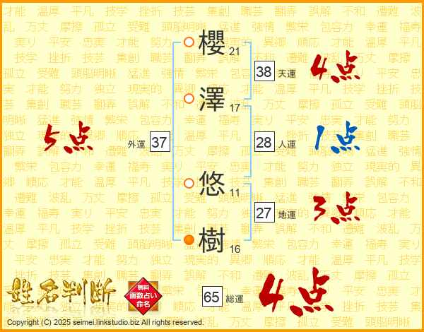 櫻(21画)澤(17画) 悠(11画)樹(16画)