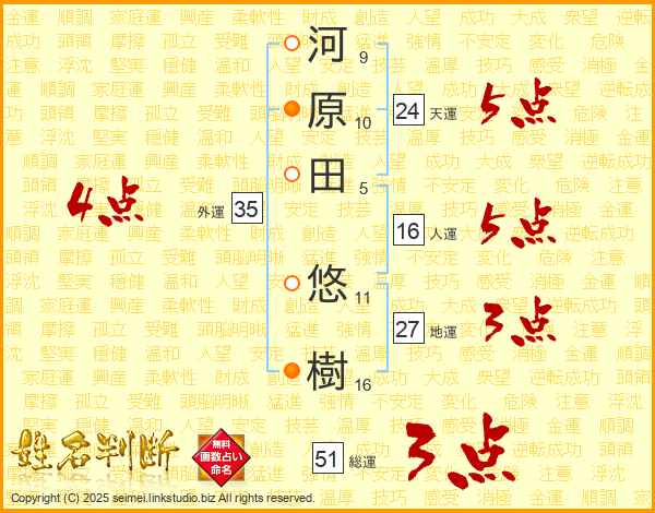 河(9画)原(10画)田(5画) 悠(11画)樹(16画)