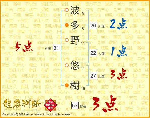 波(9画)多(6画)野(11画) 悠(11画)樹(16画)