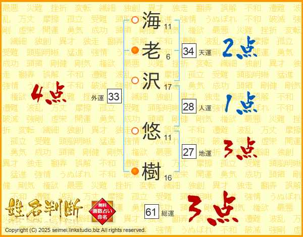 海(11画)老(6画)沢(17画) 悠(11画)樹(16画)