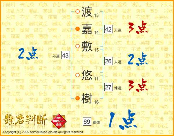渡(13画)嘉(14画)敷(15画) 悠(11画)樹(16画)